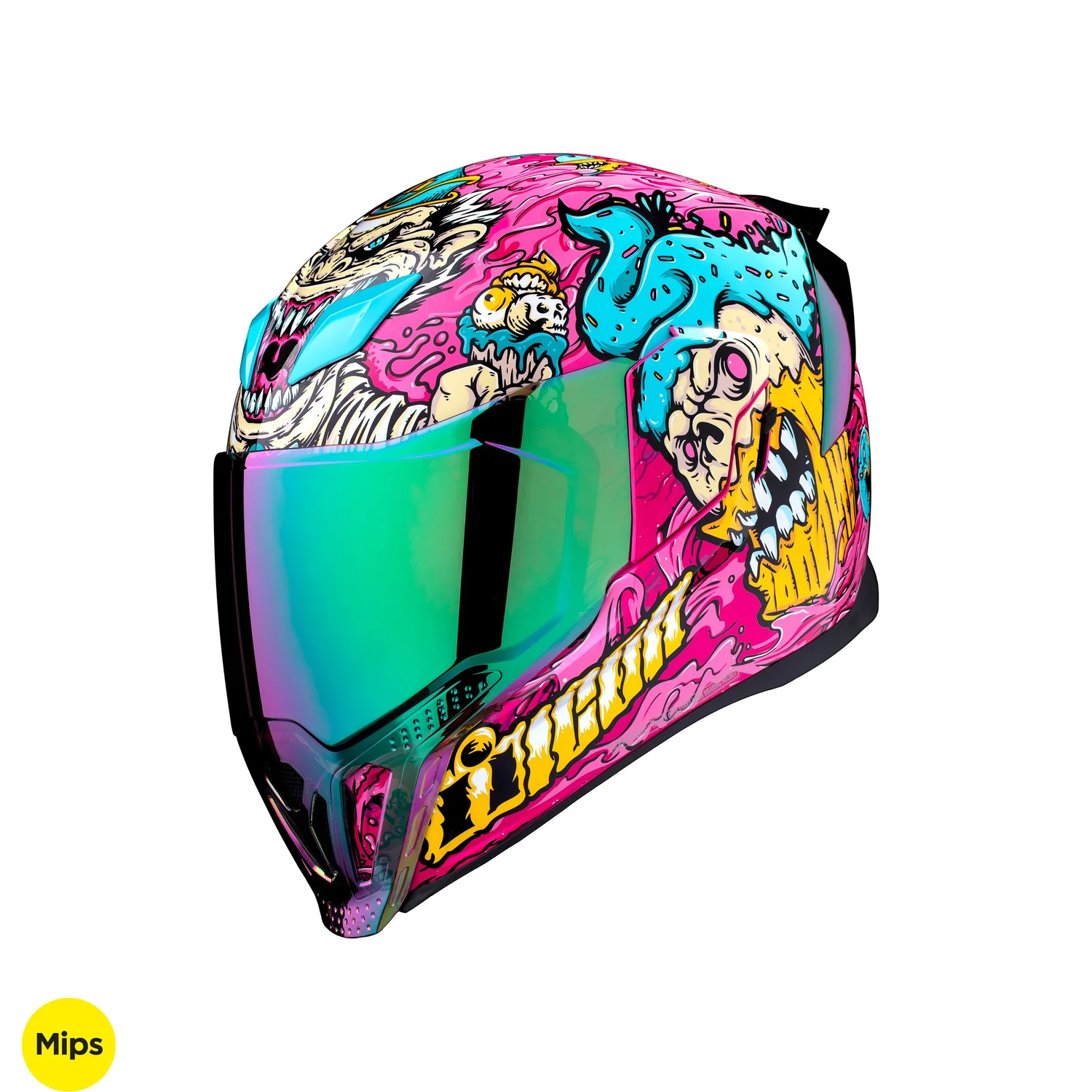 Your health teacher warned you about this. Bad food will never treat you good. A psychedelic, high-calorie nightmare of a graphic sits on top of the Airflite Snack Attack Helmet. Inside, the MIPS® Brain Protection System (BPS) stands guard, and ECE22.06 certification is all the nutrition you need. Both a clear Fog-Free Fliteshield and RST Green Fog-Free Forceshield™ are included, and a Dark Smoke internal DropShield™ helps cut the glare.